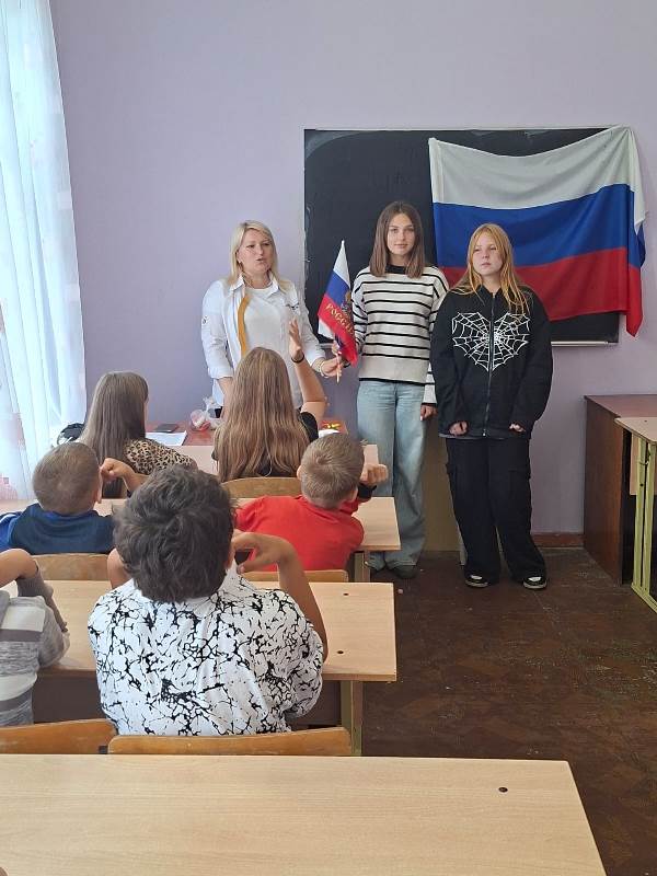 День начался с торжественной линейки, посвященной "Дню флага России", с выносом флага РФ и исполнением Гимна Российской Федерации.