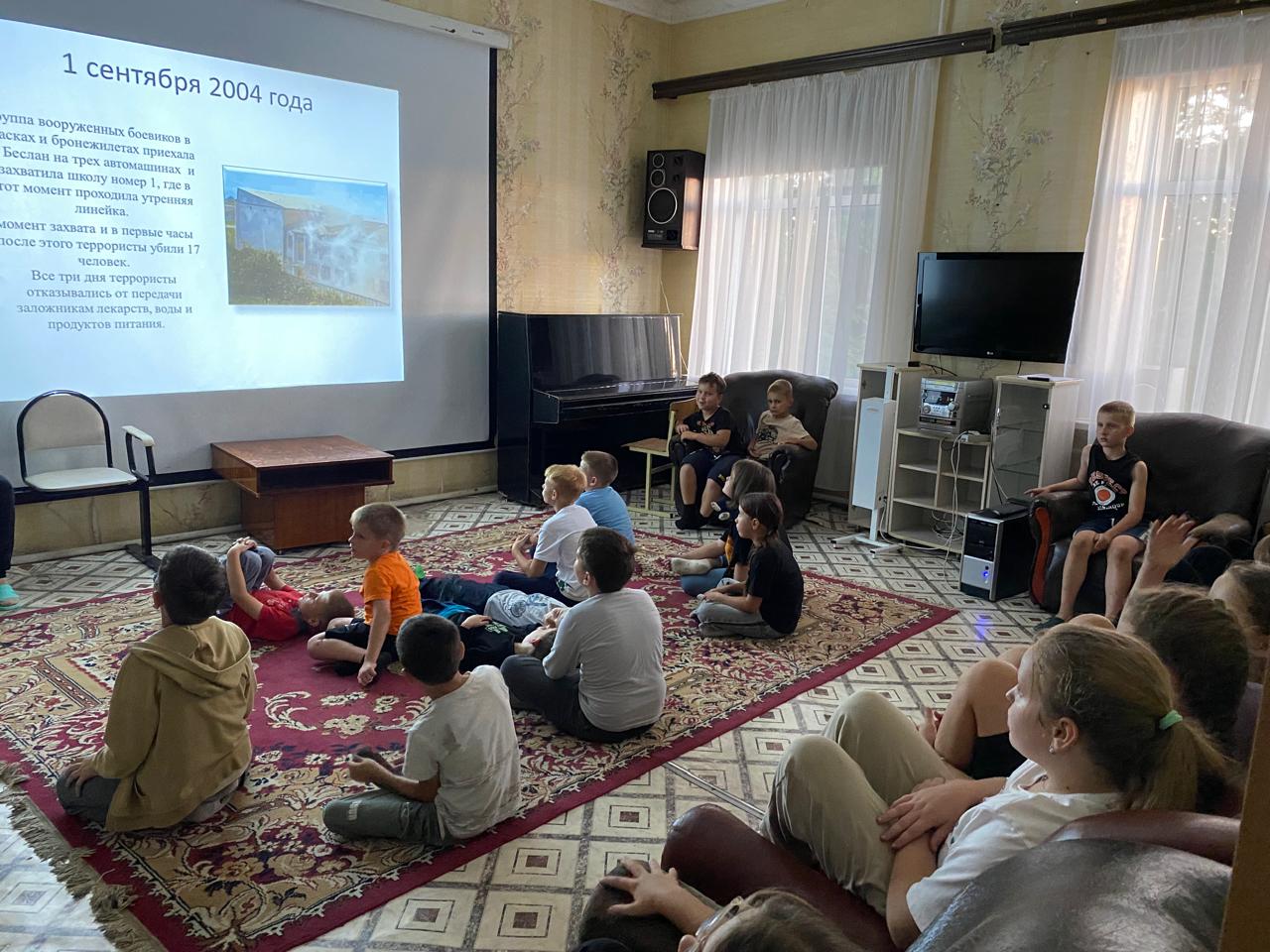В ходе мероприятия отдыхающие вспомнили о страшной трагедии, погрузившись в атмосферу боли и сострадания. Презентация, помогла ребятам осознать масштаб нечеловеческих страданий, которые пришлось пережить заложникам. Они узнали о примерах невероятной стойкости, мужества и героизма тех, кто, жертвуя собой, спасал детей в спортивном зале; о людях, которые выносили из руин школы обессиленных младенцев; об огромной силе человеческой взаимопомощи и сострадания.